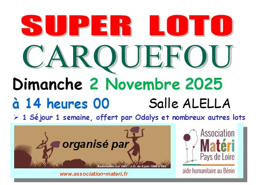 SUPER LOTO organisé par l’association « Materi Pays de Loire »Salle ALELLA – Rue Victor Hugo, 44470 CarquefouPrès du Collège Gérard Philippe.Ouverture des portes à 13h00 – début à 14h00